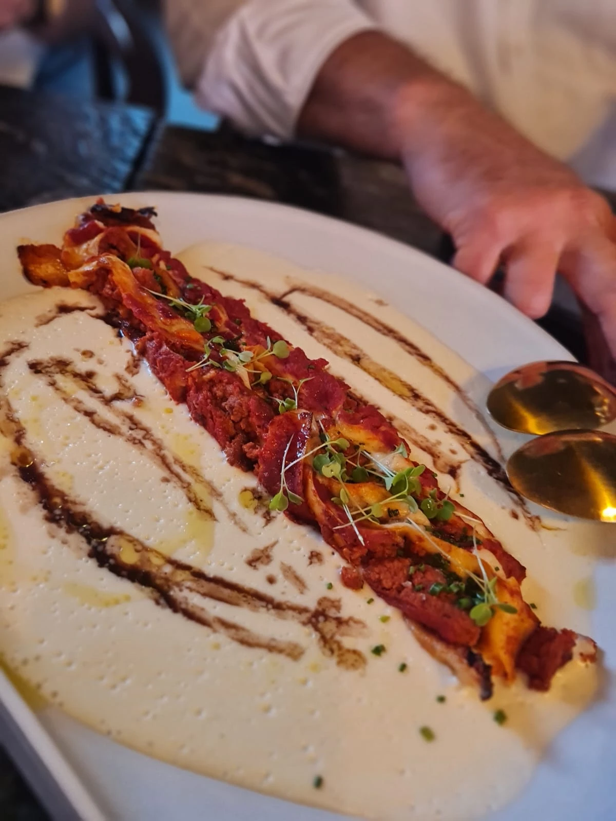 Um prato bastante chamativo servido pelo restaurante foi o Tártaro, semelhante ao steak tartar no Brasil, porém aqui servido no osso do animal do qual, no momento da refeição, é retirado o tutano para adição ao prato, muito chamativo sem dúvida, harmonizado com o Barão Hospital Alvarinho 2020.