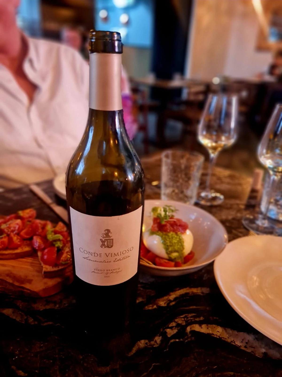 Conde Vimioso Sommelier Edition 2021 branco foi o rótulo inicial da degustação e que me chamou a atenção por se chamar Sommelier, isso se deve ao fato de a Falua convidar profissionais sommeliers para participarem juntos com eles na análise para o lançamento do rótulo. Harmonizamos o vinho branco inicial com uma burrata ao molho pesto e o Conde Vimioso Sommelier Edition 2021 rosé, harmonizamos com a salada ibérica.